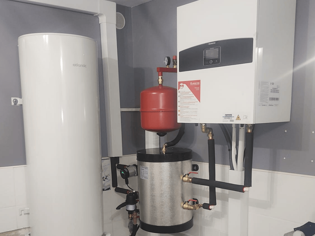 Installation intérieure de pompe à chaleur avec ballon d’eau chaude sanitaire, vase d’expansion et module hydraulique mural.